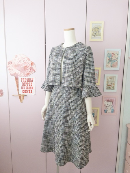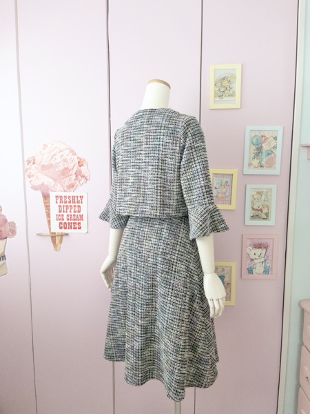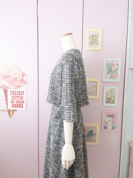 生地はユザワヤで購入した黒×パステルのニットツイード
