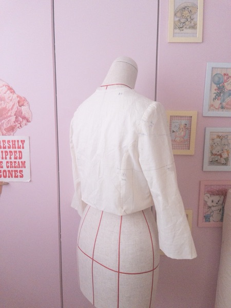 先生にトワルをチェックしていただき、前がパツパツで裾が上がって水平ではなかったことや袖がやや太くて鈍く見えるのでパターンを修正。