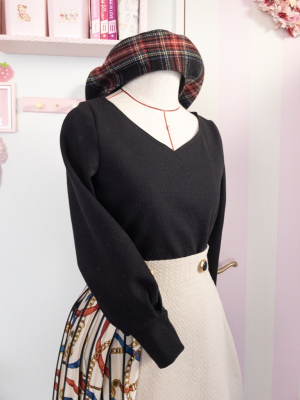 スカートもこのVネックもわたしのワードローブの定番になっていますが