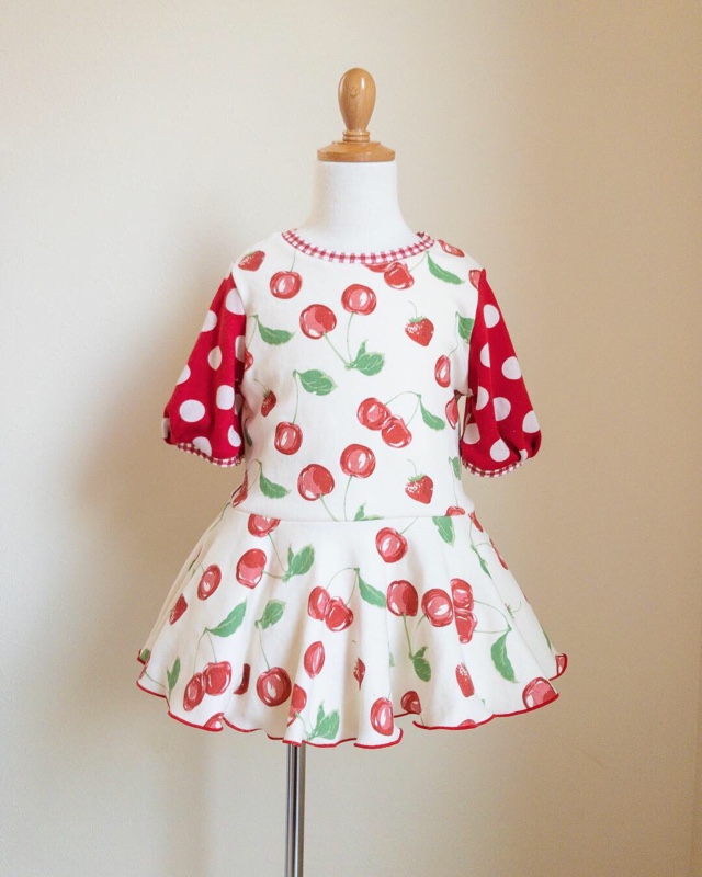 人形服にはリバティプリントと複数のレースを、こども服には伸縮性のあるニット生地を使い仕立てています。
