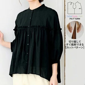 バスト上からのギャザーでふんわりとしています。迷っていた襟はロールカラーにしました。開きすぎを気にしてたら今度は詰まりすぎたかも。日除けになるかなぁ。