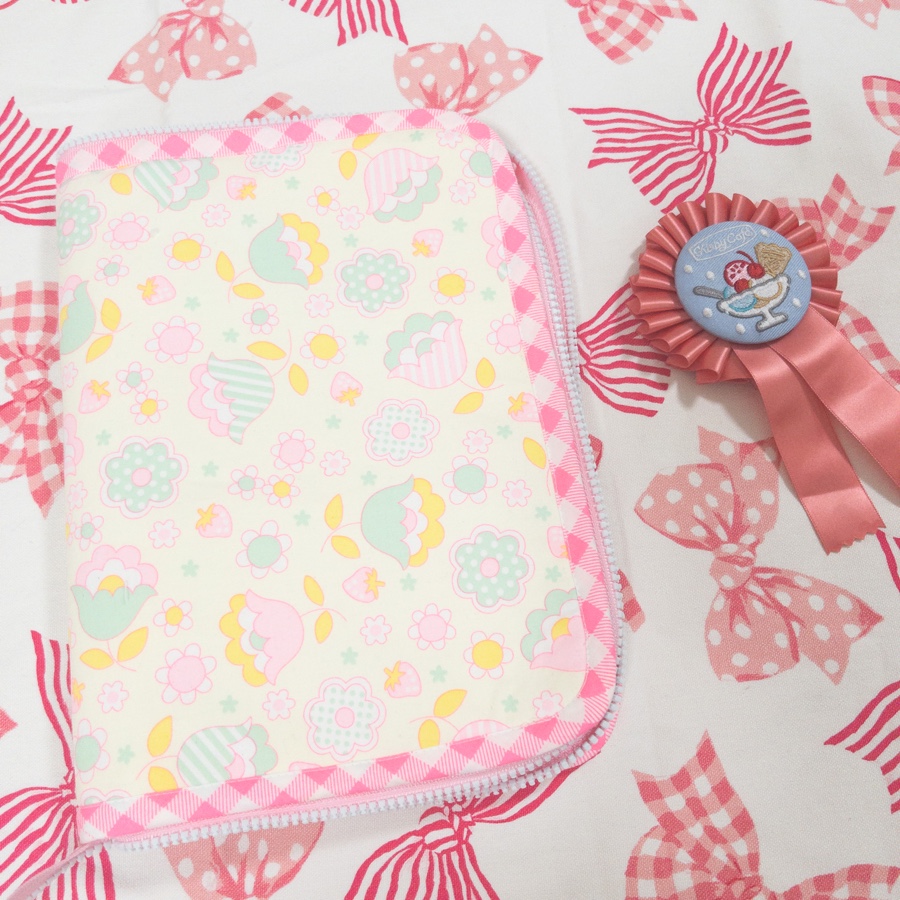 生地はpinks で購入したものをつかっています。表はえらいシンプルになったった。次回作はパッチワークをしたり表も凝りたい。