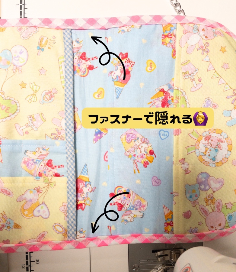厚みもあるし下にくるほうの生地は縫うときに見えないのでテープが溢れてしまいましたが、内側はファスナーで隠れて見えなくなるので問題ないよと伝えました🙆♀️