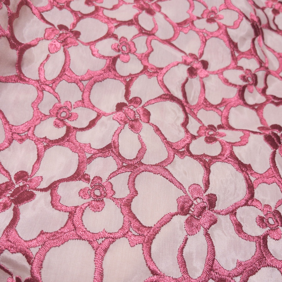 こちらはレーヨンにレーヨン糸で刺繍された生地。生地自体はベージュなんだけれど撮ると生地までピンクに見えちゃう。