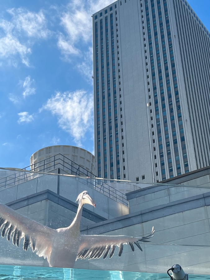 外の展示ではモモイロペリカンが気ままに過ごしていました。ペリカンちゃんたちが優雅にスイスイ泳いだり日光浴している姿が下から見られます。