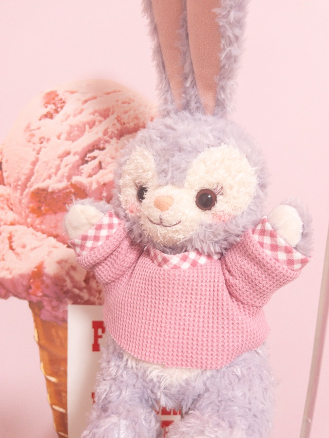 パペットのルーちゃんはニットのトップスを試着。耳〜頭が通るか確認したかった。