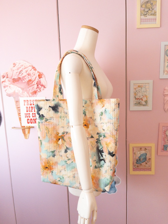 今は夏みたいな色のワンピースを縫っているんですが、はぎれが残ったので小物を作りたくなって、