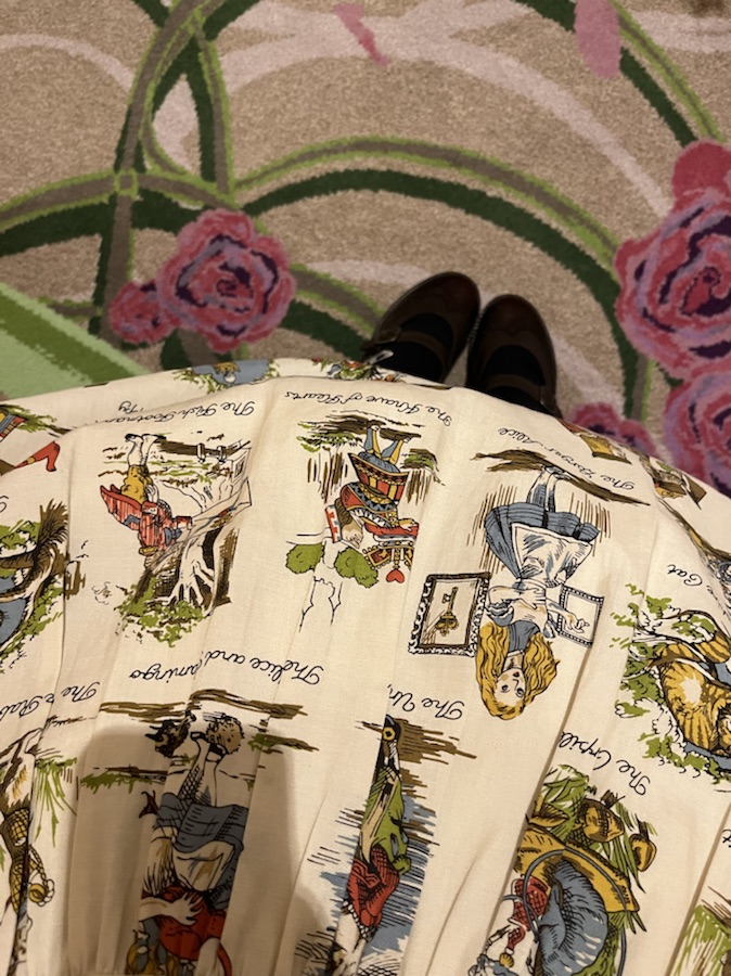 上下スカートのバランスと柄のリピートの兼ね合いであんまり切れてほしくないアリスが切れちゃうんだけれども、もう私の頭じゃ無理わかんない😇仕方ないか〜と鋏を入れました。そこに至るまでかなりの時間悩んだ。