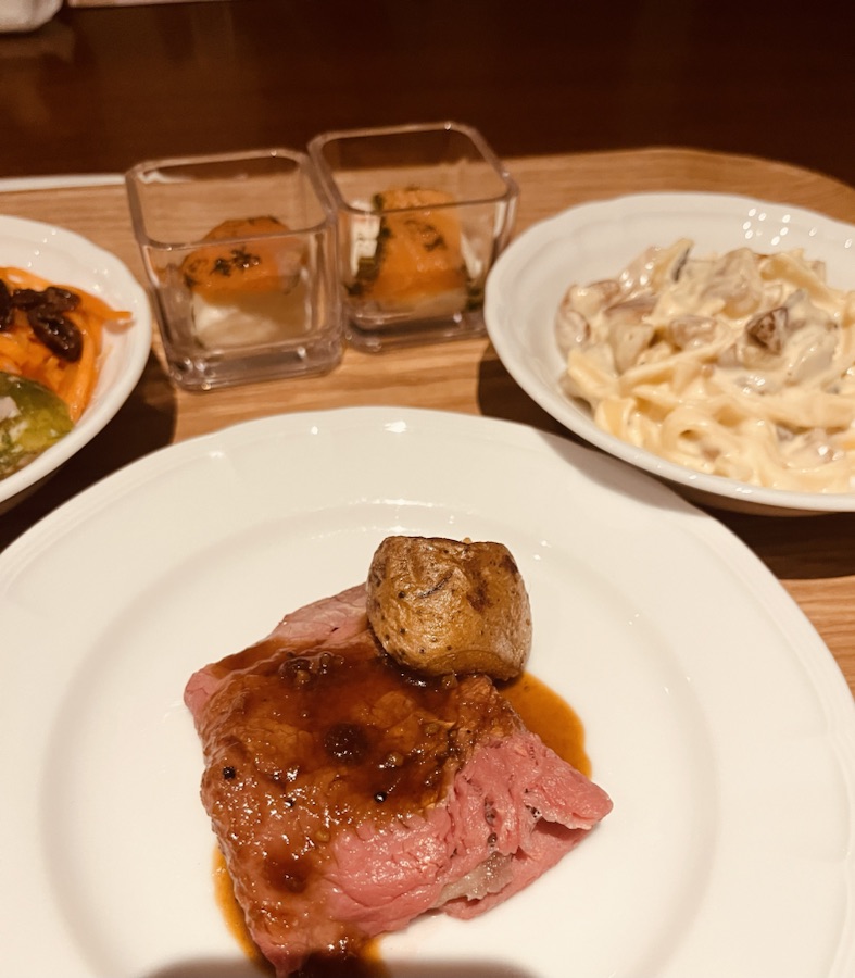 大好きなキャロットラペとローストビーフとサーモン乗せのポテトサラダ、きのこと栗のクリームパスタ。このパスタ本当美味しかったのでまた取りに行った。永遠に食べたい。