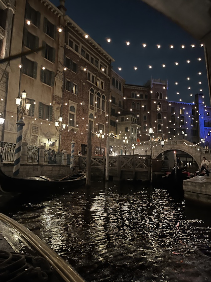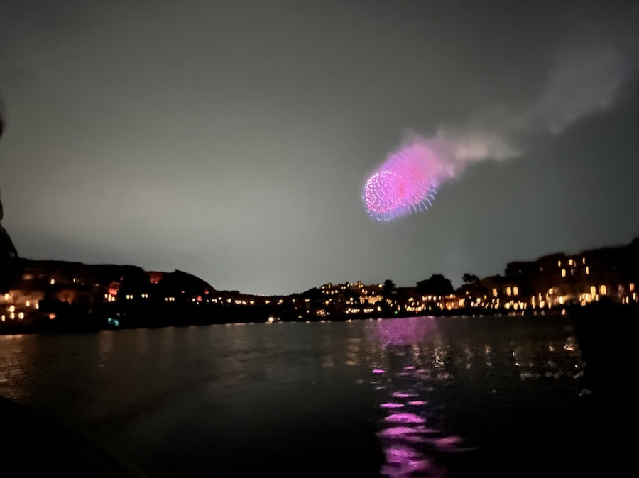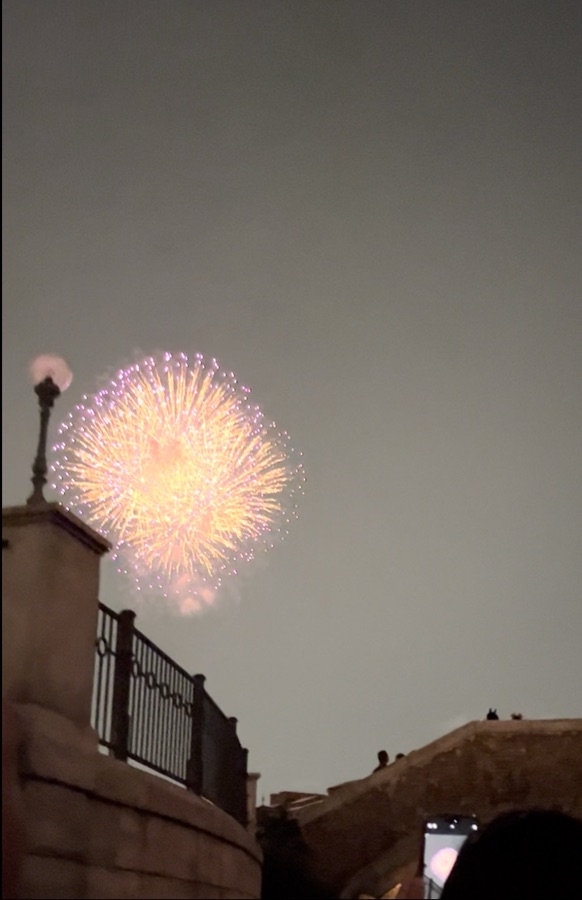 ゴンドリエさんから「今から花火が上がりますよ。一日のうちに二艘だけここ(ゴンドラ)から見られるのでラッキーですね!」と。