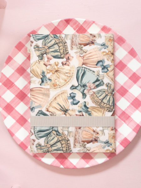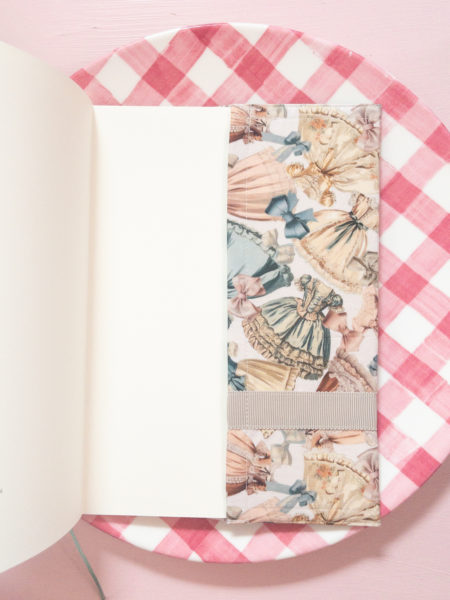 MDノートにはもともと薄いカバーがついているんだけれど、クシャっとして外れやすいのでBabyStepで購入したリボンとドレスのプリントで作ったカバーをつけました。