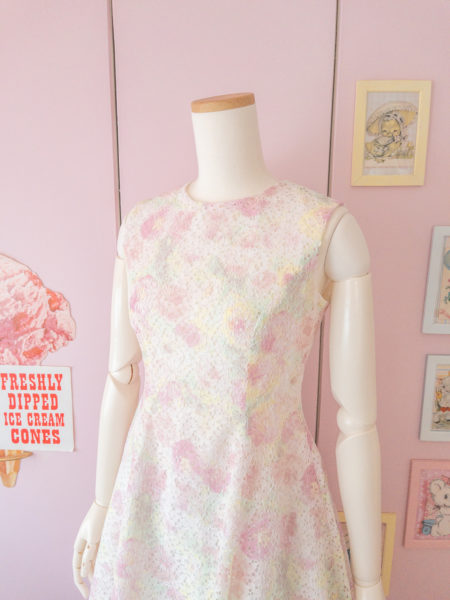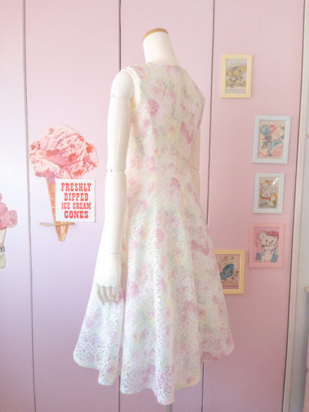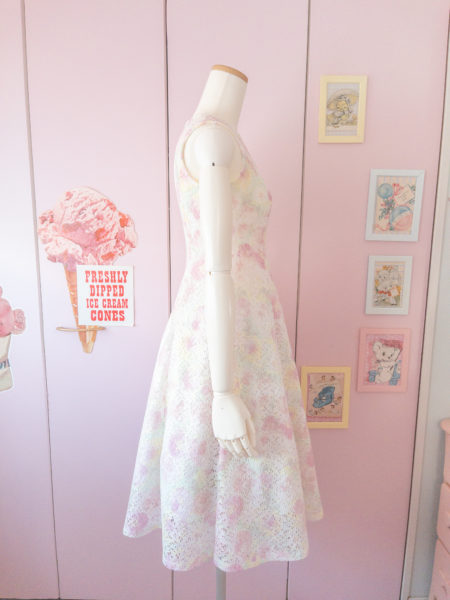 暗く写っているけれど表地はポリエステルのラッセルレースです。穴が至る所にありますが縫いにくい箇所は全くなく、いつも通りに仕立てちゃった。