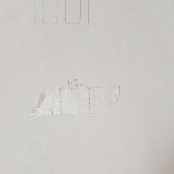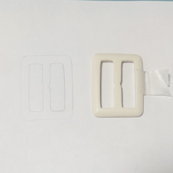 バックルを置いて内側と外側をなぞり、次にマスキングテープを巻いて印をつけ、どのくらい生地が必要なのか計測して型紙を作ります。