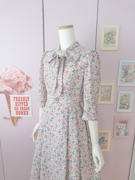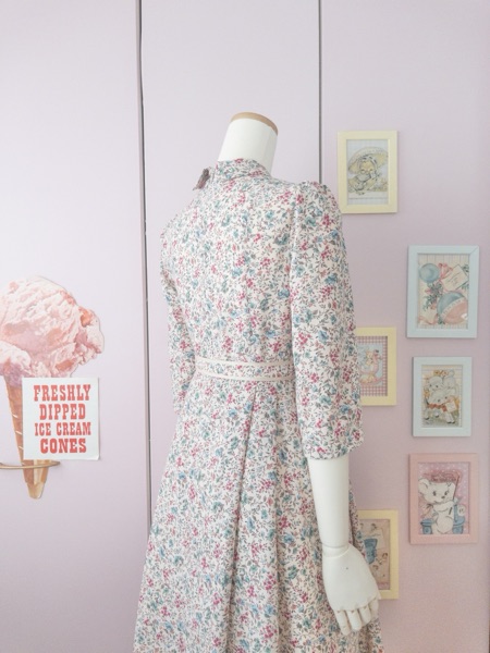 パターンは雪の宿ワンピースと同じでプリンセスラインをウエストで切り替えてタックのスカートをつけています。今回は雪の宿ワンピースではかなわなかったボウタイをつけました。結ぶ際に左右で長さがなるべく均等になるように、差を6cmつけています。